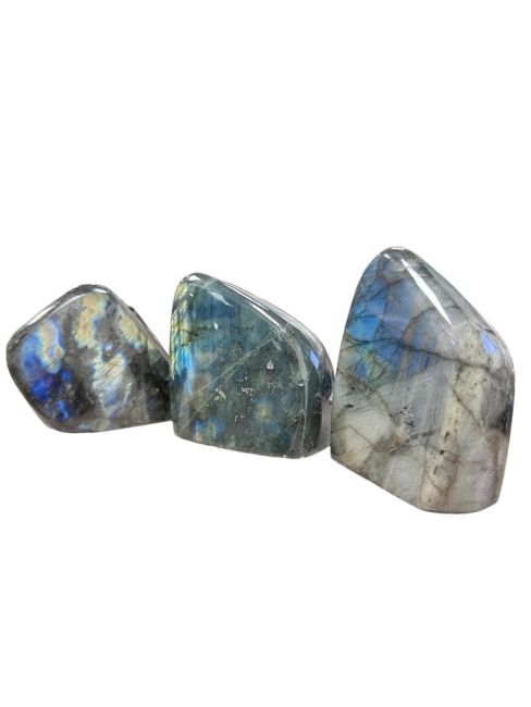 Ogni blocco di labradorite è unico e presenta riflessi che vanno dal blu intenso al verde smeraldo e all'oro.