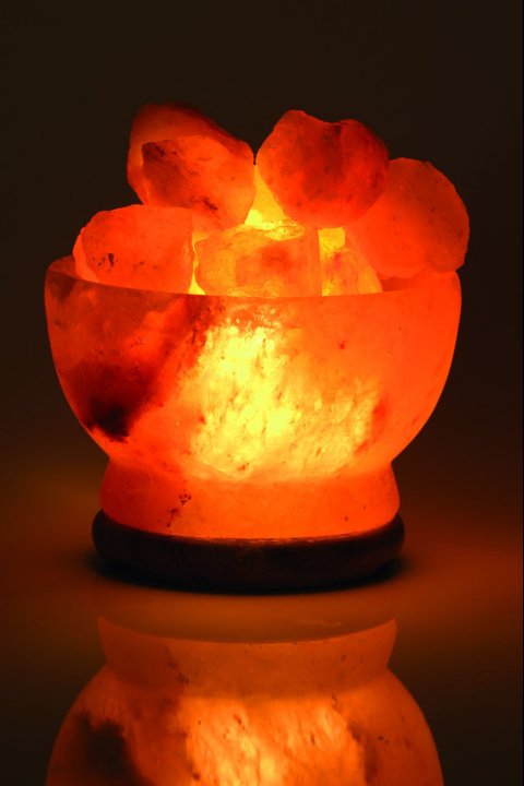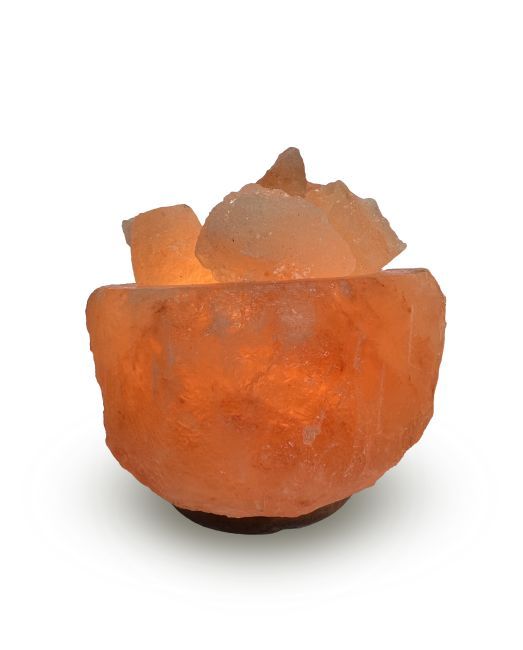Lampada di sale naturale con base in legno. Ciotola di sale cristallino sagomata per contenere ciottoli di sale, con una lampadina alla base per diffondere una splendida luce.