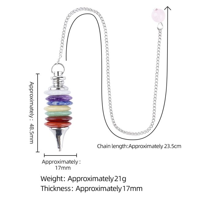Pendolo divinatorio realizzato con pietre naturali, composto da sette dischi sovrapposti, che rappresentano i colori tradizionalmente associati ai chakra.